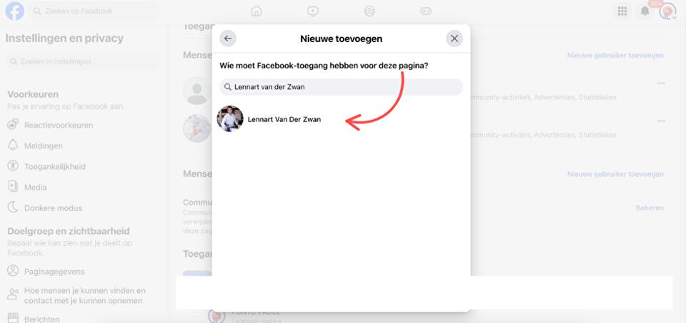 Stap 6: Hier zie je een overzicht van de mensen die op dit moment Facebook-toegang hebben. Klik op ‘Nieuwe gebruiker toevoegen’.